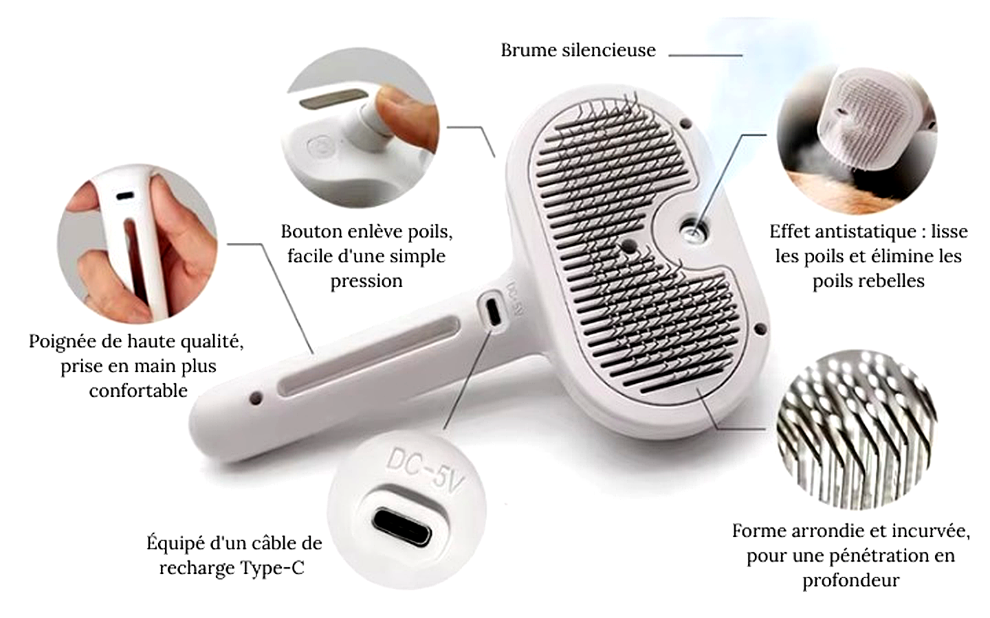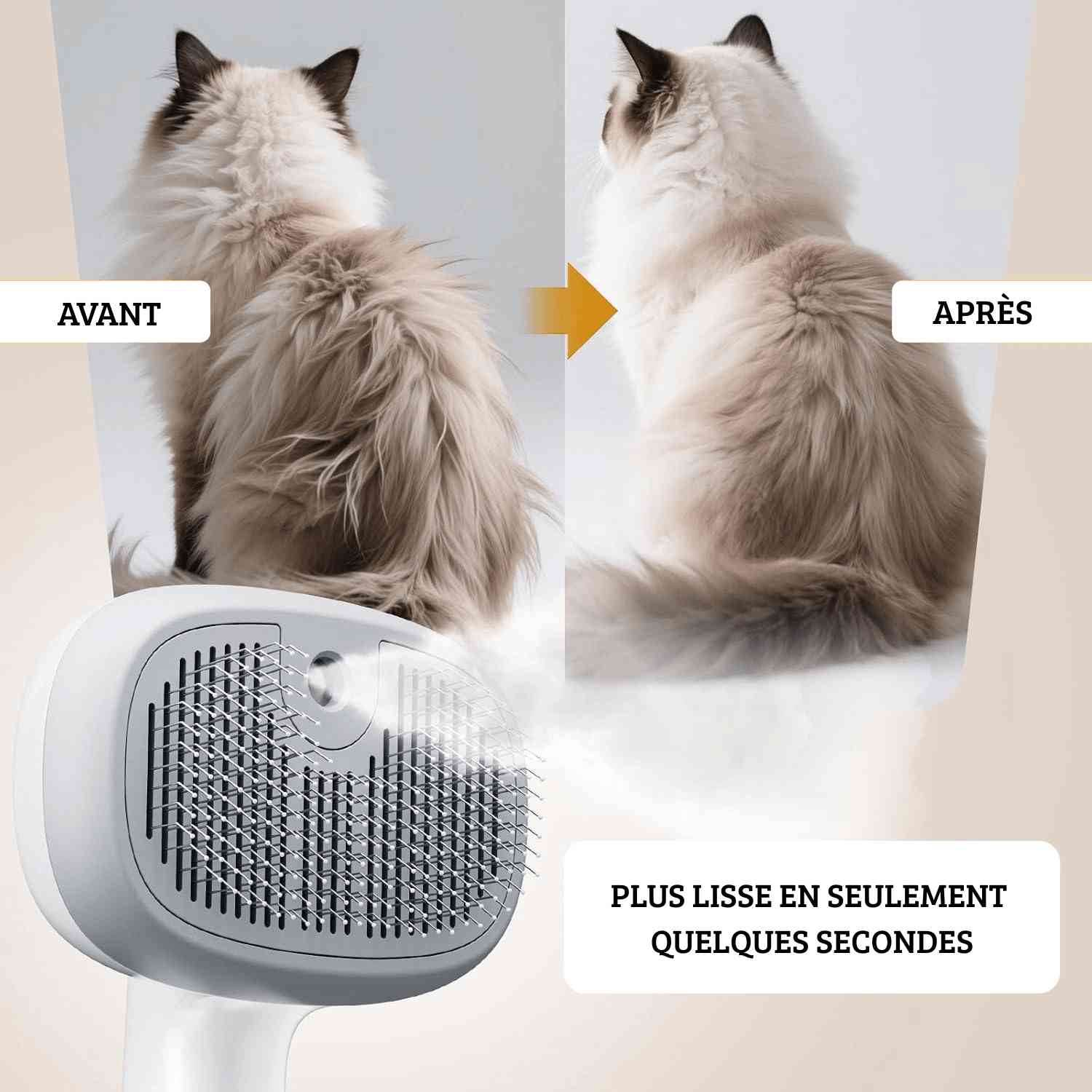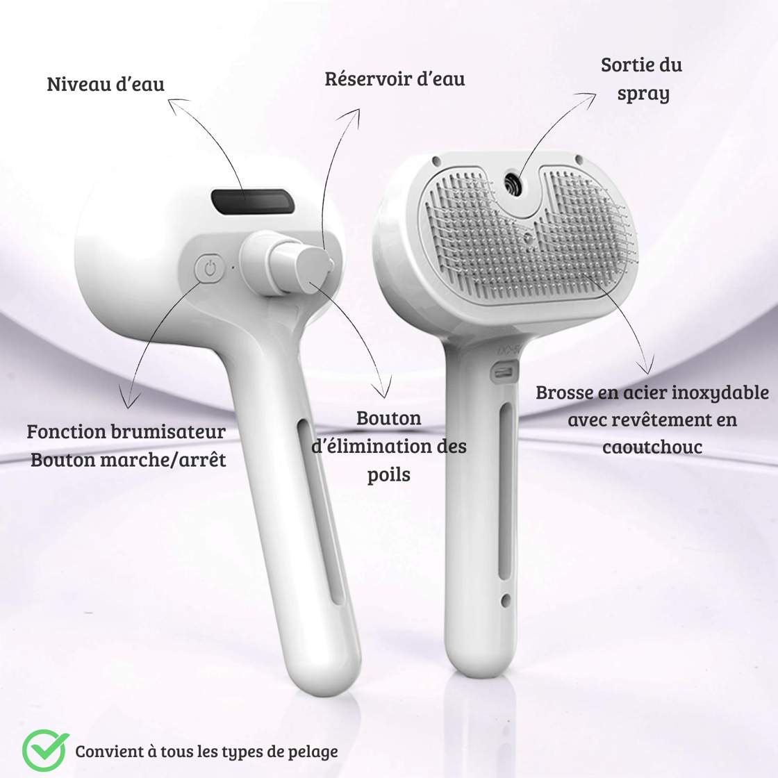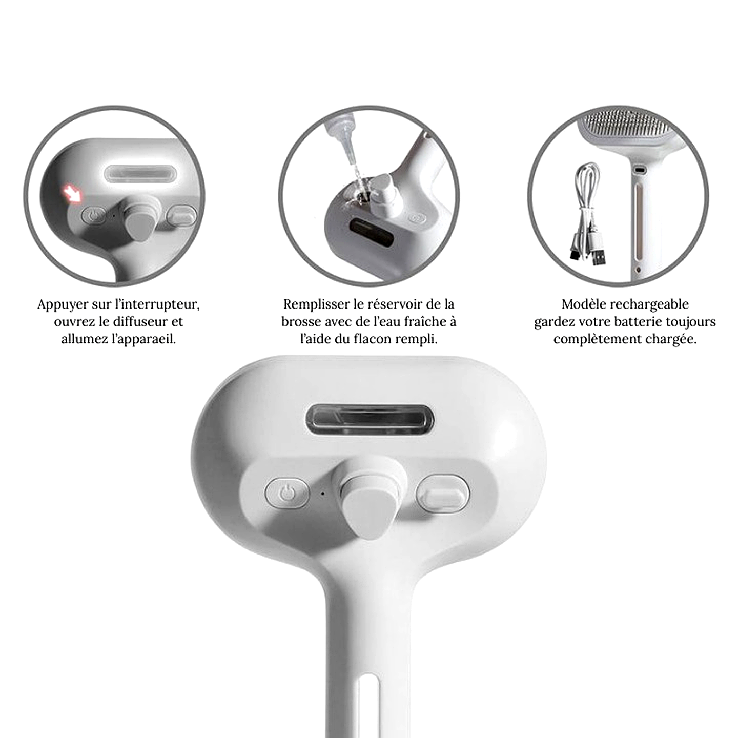 1.Fill the water tank - 2.Activate the mist - 3.Brush gently - 4.Remove hair with one click